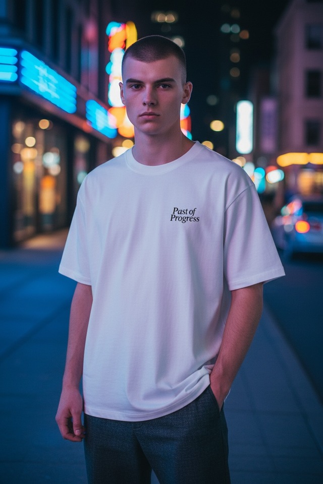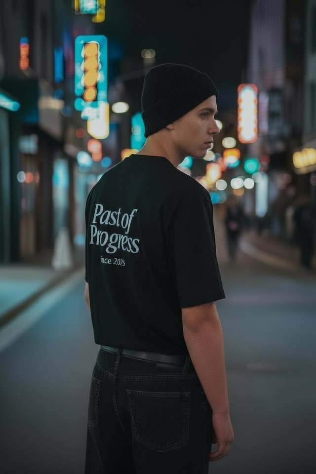 PAST OF PROGRESS PAST-003 Logo T-shirt 進化を刻み、過去を着る。 ストリートの空気を纏いながらも、どこか上品な佇まいを持つロゴTシャツ。 日本の職人による丁寧なプリントが、シンプルながら確かな存在感を放ちます。 肉厚でドライな質感のヘビーウェイトコットンを採用。 透けにくく、身体のラインを拾いにくい安心感のあるシルエットです。 着るほどに柔らかく馴染み、ヴィンテージのような風合いへと育っていきます。 首元はダブルステッチ、肩には補強テープを通してタフな仕上がりに。 太番手の糸であえて粗めに縫うことで、無骨さと上品さを両立。 袖口と裾口には2本針仕上げを施し、洗うたびに自然なパッカリングが生まれます。 ストリートと静謐、その狭間で光る一枚。 M/L/XL 身丈/69/73/76 身幅 /52/55/58 肩幅 /45/48/53 袖丈/20/21/22